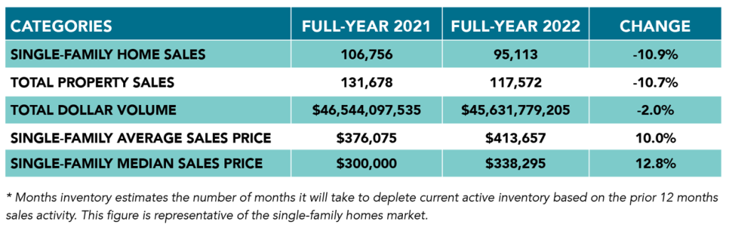 The mid-year reversal of the market radically impacted the volume of sales activity throughout the county; however, sales volume is only down to 2019 levels and prices are remaining steady – for now.