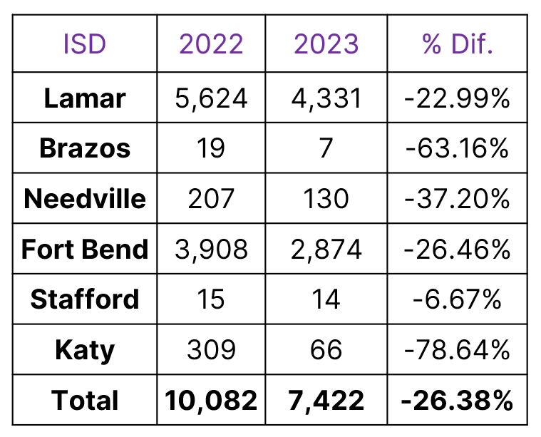 The 2023 tax year saw a 26% overall decrease in new construction activity. Tax year 2022 saw the largest increase in residential inventory FBCAD has ever seen, around 10,000 new homes. This year, those are down to pre-pandemic numbers or about 7,400 homes.